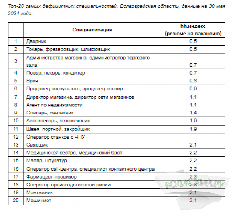 Как сообщили Волжский.ру в пресс-службе онлайн-платформы по поиску работы и сотрудников, в топ-7 самых дефицитных сотрудников попали дворники, токари/фрезеровщики/шлифовщики, администраторы магазина/торгового зала, повара/пекари/кондитеры, врачи, продавцы, директоры магазинов. При этом на одну вакансию приходится от 0,5 до 2,1 резюме.