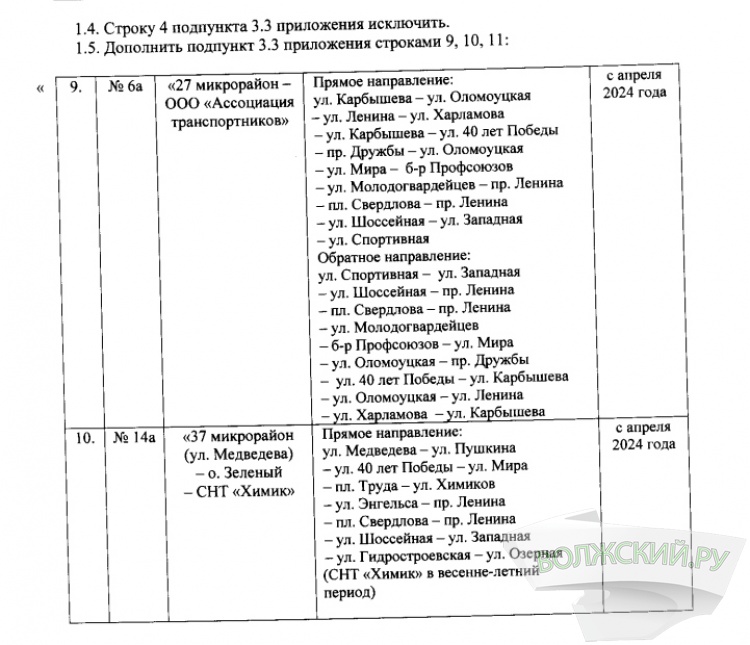 Как узнал Волжский.ру из документа, поправками продлевается действие свидетельств на осуществление регулярных перевозок и карт маршрутов по нерегулируемым тарифам № 3, 5, 5а, 6, 6а, 11, 14а, 15а, 16, 17, 24а, 105а до 22 июля 2025 года. Также внесены изменения в схемы маршрутов. Маршрут № 6а пустят по улице им. Ю.П. Харламова в 28 микрорайоне. Данную идею обсуждали еще в декабре на заседании комиссии по БДД.