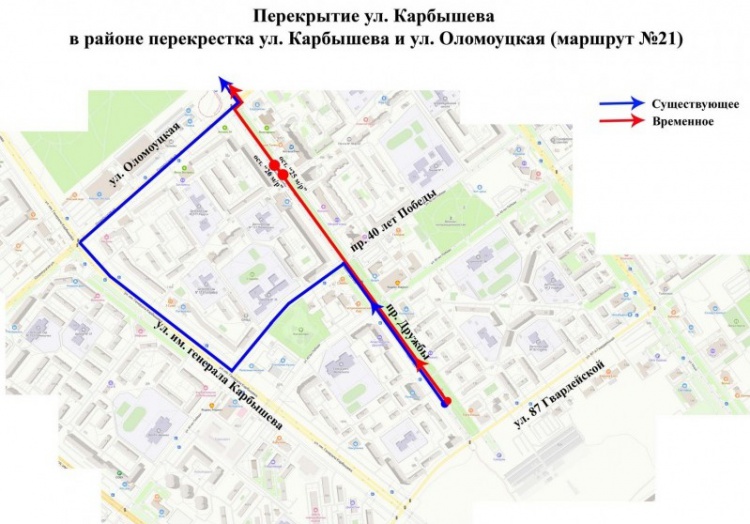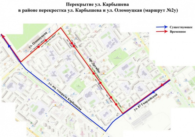 Второй участок перекрытия запланирован с 1 по 20 июля в районе пересечения улиц им. генерала Карбышева и Оломоуцкой. Данный участок затронет маршруты автобусов № 2у и № 21. Автобусы № 2у будут объезжать через улицу 87-ю Гвардейскую по проспекту Дружбы и улице Оломоуцкой. А автобусы № 21 будут следовать по проспекту Дружбы на участке от улицы Александрова до 32 микрорайона.