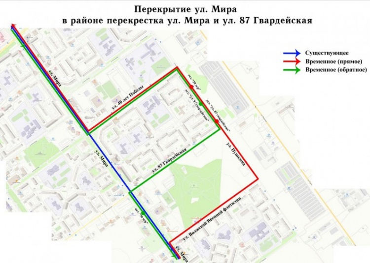 С 8 по 31 июля также будет перекрыта улица Мира в районе пересечения с 87-й Гвардейской. Автобусы № 14, 30, 41, 42, 51, 55 будут объезжать перекрытый участок по улице Пушкина через улицы Волжской Военной Флотилии и 40 лет Победы. Напомним, с 17 июня на полтора месяца перекрыт участок 87-й Гвардейской. Данное неудобство также связано с ремонтом теплосетей (подробнее...).
