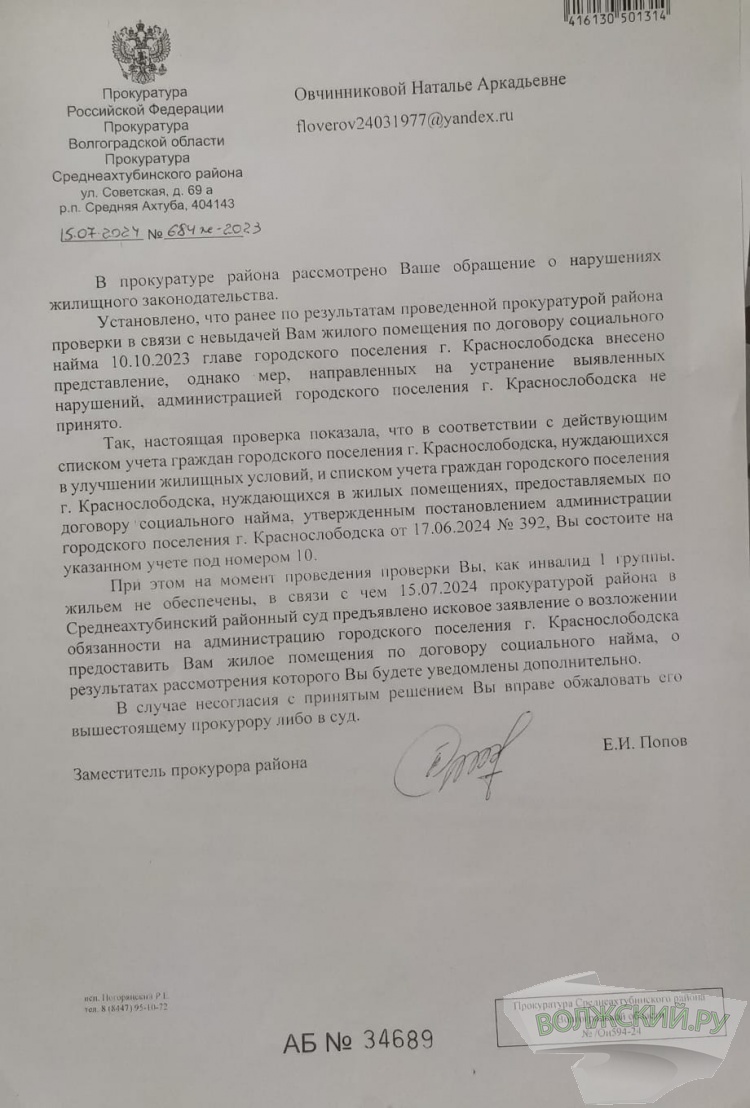 Женщина обратилась в Генеральную прокуратуру, которая спустила запрос в прокуратуру Среднеахтубинского района. Согласно ответу последней, ещё 10 октября 2023 года в адрес главы Краснослободска внесли соответствующе представление.