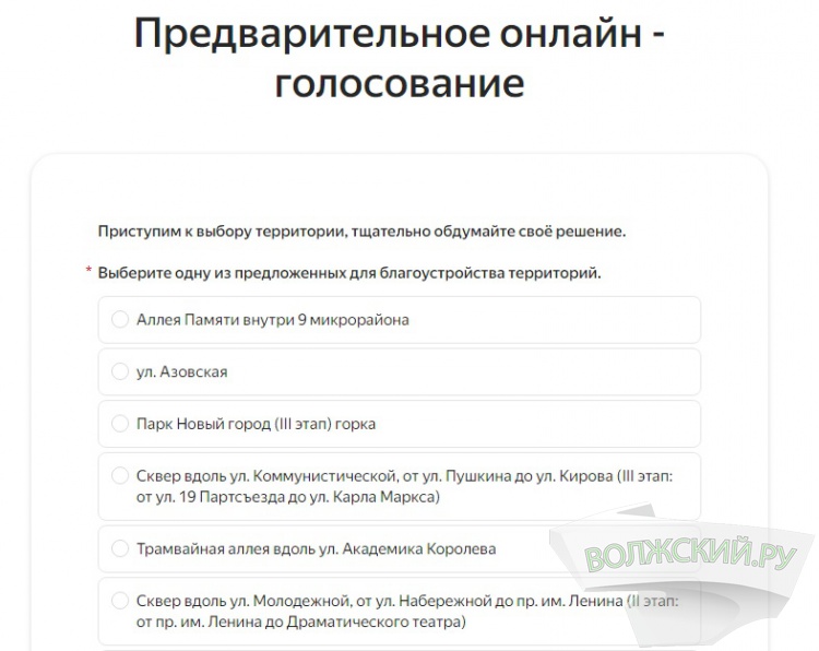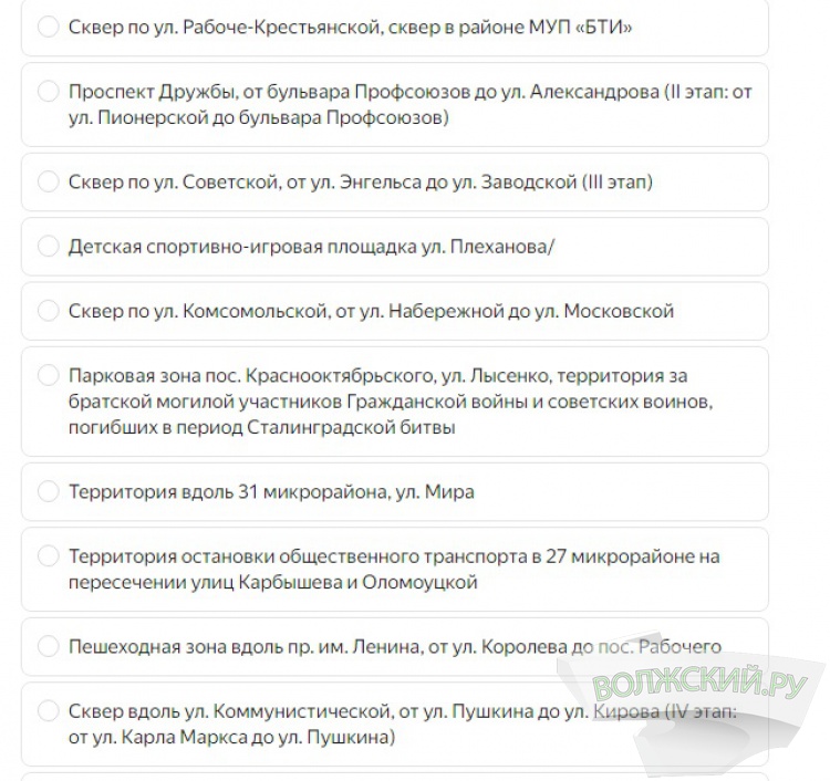 Соответствующее информационное сообщение комитет благоустройства и дорожного хозяйства опубликовал накануне в информационных сообщениях на сайте городской администрации. Как узнал Волжский.ру из короткого сообщения, голосование должно стартовать 1 декабря и продлиться до 15 декабря. Следом идёт рабочая ссылка на голосование со списком территорий, то есть по факту голосование уже идёт, и судя по результатам, почти сто волжан уже отдали свой голос (подробнее...).