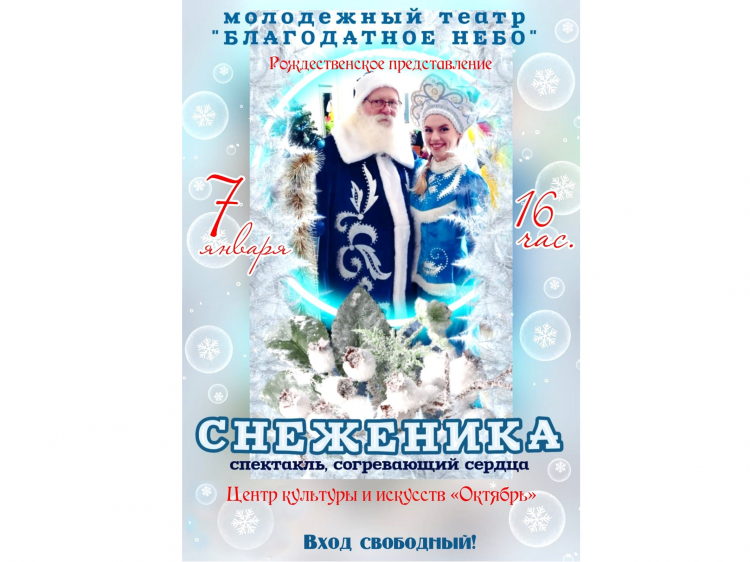 Как рассказали Волжский.ру в пресс-службе Калачёвской епархии, в Центре культуры и искусства «Октябрь» покажут спектакль «Снеженика» (0+) по мотивам сказки «Морозко» в исполнении театра «Благодатное Небо» (МЦ «Родина» из Волгограда) и творческих коллективов Волжского. Начало – в 16:00 часов. Вход свободный.
