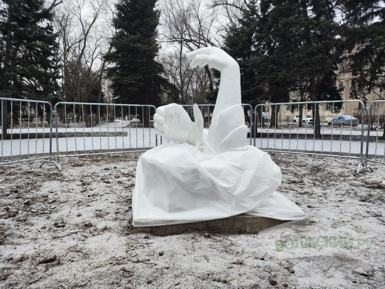 Вокруг скульптуры планируется устроить клумбу с цветами и кустарниками. В частности, там обещают высадить сорта лилий, выведенных Зоей Сапожниковой. А пока объект чисто белого цвета укрыт пленкой. Интересно, как долго он сохранит свой белый цвет в погодных условиях Волжского?