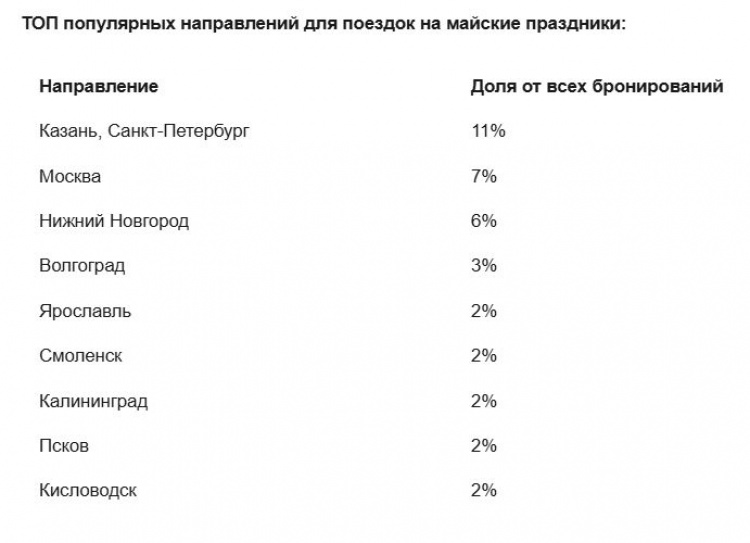Самыми популярными городами для путешествий на майские праздники стали Казань и Санкт-Петербург — на них приходится по 11% от всех заказов по стране. Москва, которая как правило лидирует по количеству бронирований большую часть года, по данным ранних бронирований на майские праздники замыкает тройку с долей 7% от всех заказов. Это может быть связано с тем, что предложений для путешественников в столице больше, поэтому туристы не спешат бронировать отели за большой срок.