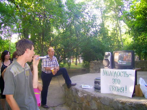 И я, ведомый чувством любопытства, пошел на песню. Ее с нескрываемым чувством патриотизма и приобретенным вне заборов парка вдохновением (спиртное в парке в тот день не продавали) пел худощавый молодой человек. Поскольку это был конкурс на лучшее исполнение караоке - он неотрывно смотрел на экран телевизора, размещенный на сцене. Впрочем, как и публика, которая восторженно поддерживала исполнителя. Правда, меня несколько смутил его гипертрофированно серьезный вид. Хотя с другой стороны - ничего удивительного. Песня обязывает..