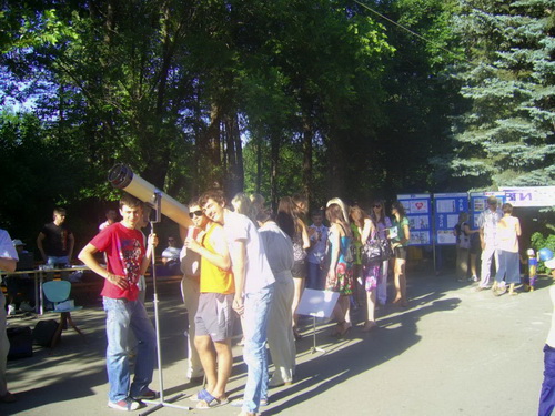А не зря я сегодня звездочета видел. Вот и его телескоп! Только стоят возле него студенты ВПИ и предлагают всем желающим на звезды взглянуть. Подначивают.