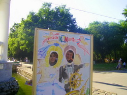 Я уж было хотел пожурить их за легкомысленность, но когда увидел улыбчивые молодые лица, от души хохотавшие перед ротондой отказался от этой затеи. И даже попросил одну пару попозировать для репортажа. Засунув свои лица в декоративную доску, ребята чуть не задохнулись от смеха.