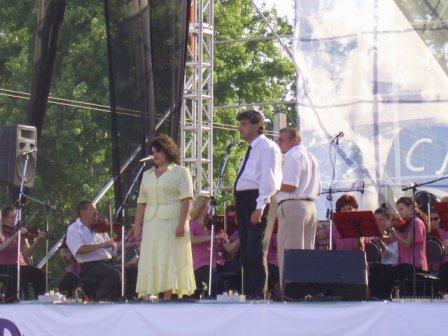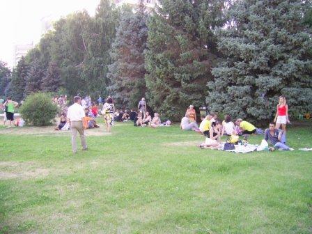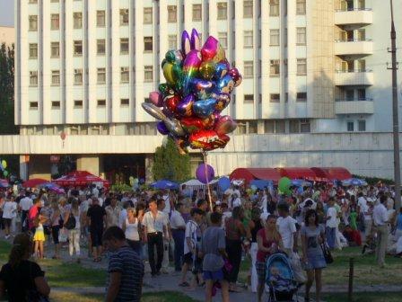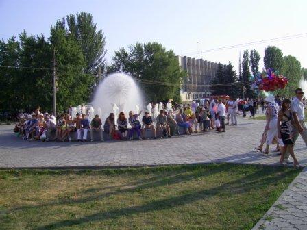 Когда я, ровно в 18-00, пришел на площадь - она была полупуста, а на сцене выступали лишь профессиональные и самодеятельные ансамбли, да пели одинокие и не совсем одинокие певцы. Народ не был пассивным созерцателем: в ожидании московского гостя он потихоньку загружался пивом и жался к спасительной прохладе фонтанов. Не обошлось и без курьезов. Игривая молодежь затеяла волейбол с воздушным шариком, которым впоследствии коварным образом завладела с виду приличная бабушка. Только после серии увещеваний и клятвенного заверения свидетелей шарик был возвращен законным владельцам…